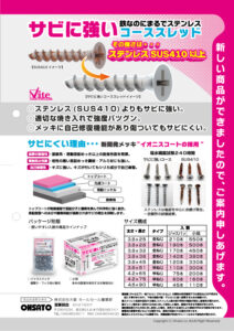サビに強いコーススレッドは、新開発された表面処理である『イオニスコート』を採用。塩水噴霧試験においてステンレスSUS410を凌ぐ耐食性を得ています。打ち込み時にビスにつくキズに対しても自己修復して錆びから守ります。