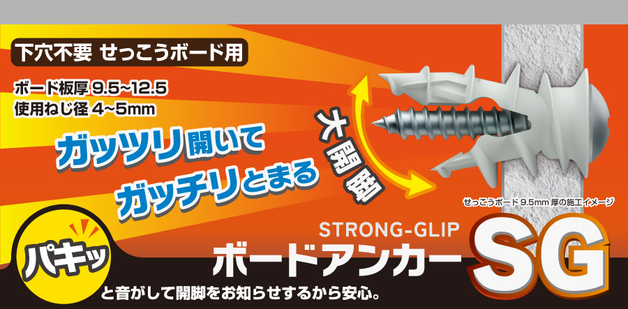 ボードアンカーSGは、せっこうボード用アンカーの中でも、ねじ込み式にあたり、施工の簡略化・確実性・低コストを突き詰めたアンカーになります。
